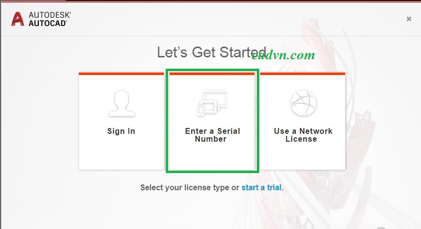 Bước 6: Sau khi quá trình cài đặt thành công, bạn tắt hết chương trình autocad và các chương trình khác đi. Sau đó mở lại Autocad 2018. Bạn click vào Enter a Serial Number để nhập key và số seri